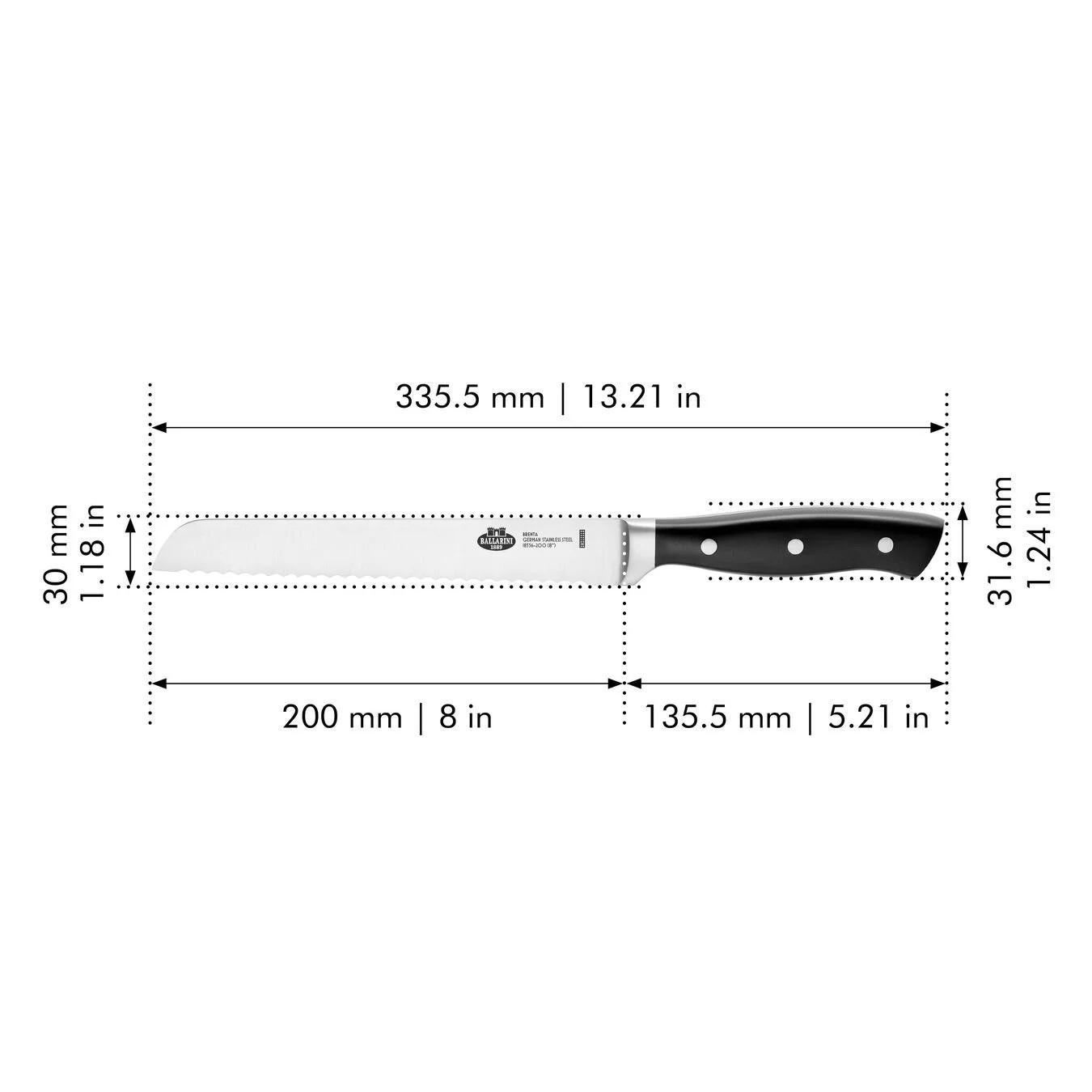 Il coltello premium è forgiato in acciaio inossidabile tedesco, garantendo un perfetto equilibrio quando lo si tiene in mano e un taglio ottimale di tutti i tipi di pane. La lama seghettata da 20 cm e l’impugnatura ergonomica in plastica con tre rivetti conferiscono al coltello da cucina un aspetto tradizionale e senza tempo, rendendolo allo stesso tempo piacevole da tenere in mano e sicuro da usare.