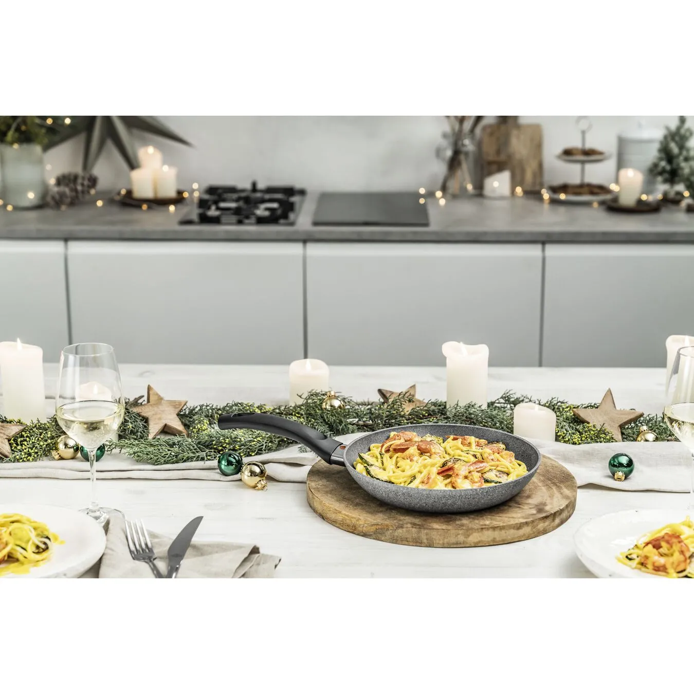 Nella padella della linea Ferrara Granitium di BALLARINI puoi preparare piatti sani e deliziosi in un batter d’occhio. Il rivestimento antiaderente GRANITIUM a 5 strati ti permette di ridurre l’utilizzo di oli e grassi, per cucinare in modo più salutare senza rischiare che le pietanze si attacchino o brucino durante la cottura. Inoltre, l’ulteriore rinforzo con particelle minerali rende il rivestimento ancora più resistente, così potrai anche usare spatole e altri utensili in metallo senza alcun problema. Questo padella di alta qualità firmato BALLARINI stupisce anche in termini di maneggevolezza: il manico ergonomico garantisce una presa sicura e rimane freddo grazie a un ottimo isolamento termico. La protezione ignifuga in acciaio inossidabile garantisce ulteriore protezione dal calore in aumento sui lati. Il dispositivo Thermopoint integrato nel manico è un ottimo alleato per evitare gli sprechi energetici e ti aiuta a cuocere o arrostire a puntino i tuoi piatti più sfiziosi. Quando il Thermopoint è di colore rosso potrai abbassare la fiamma, mentre il verde indica che il padella si è raffreddato e può essere maneggiato senza alcun pericolo. Questa padella, oltre a essere adatta alla lavastoviglie, può anche essere risciacquata con un panno umido. Il massiccio nucleo in alluminio del fondo bimetallico conserva il calore e lo diffonde in maniera uniforme. È possibile utilizzare la padella su tutti i tipi di piani cottura, compresi quelli a induzione. Affidati alla padella della linea Ferrara Granitium di BALLARINI con diametro di 26 cm e vizia i tuoi ospiti e la tua famiglia con squisiti piatti preparati con cura e attenzione al risparmio energetico.
