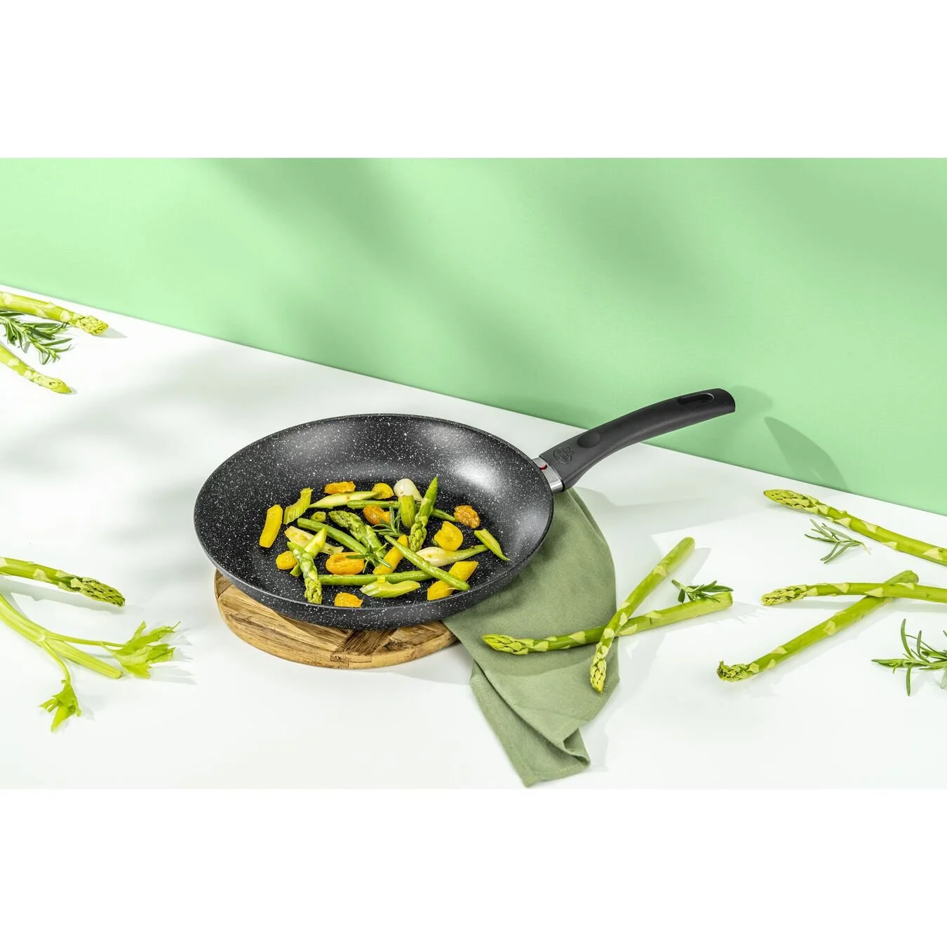 Una grande padella per una grande innovazione. La padella di 28 cm della serie BALLARINI Vipiteno ti stupirà per le sue caratteristiche e l’innovativo dispositivo THERMOTION. Il dispositivo si solleva non appena la padella si è riscaldata: questo ti aiuta a capire in un attimo quando la padella ha raggiunto la temperatura di cottura. Così, potrai già abbassare la fiamma, risparmiando energia. Quando la padella si è nuovamente raffreddata, l’indicatore THERMOTION si abbassa: ora puoi maneggiare la padella in totale sicurezza e lavarla senza danneggiarla.