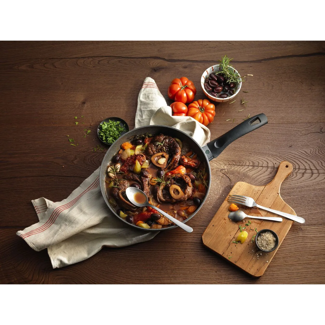 Con il set di padelle della serie Ferrara Granitium si possono preparare deliziosi piatti di carne o pesce anche impanati oppure sostanziosi piatti a base di uova. Le padelle hanno un manico lungo per un uso sicuro; inoltre sono estremamente robuste. Il resistente rivestimento antiaderente a cinque strati è rinforzato con particelle minerali per una perfetta preparazione dei cibi. La speciale base a induzione, sviluppata da Ballarini, distribuisce il calore in modo rapido e uniforme ed è perfetta per tutti i piani di cottura, compresa l’induzione. Il design moderno ma senza tempo si adatta perfettamente a qualsiasi casa. Con questo set di padelle di BALLARINI potrai cucinare con successo molti piatti deliziosi per deliziare sia la tua famiglia che i tuoi ospiti. Inoltre, la pulizia non è affatto un problema.