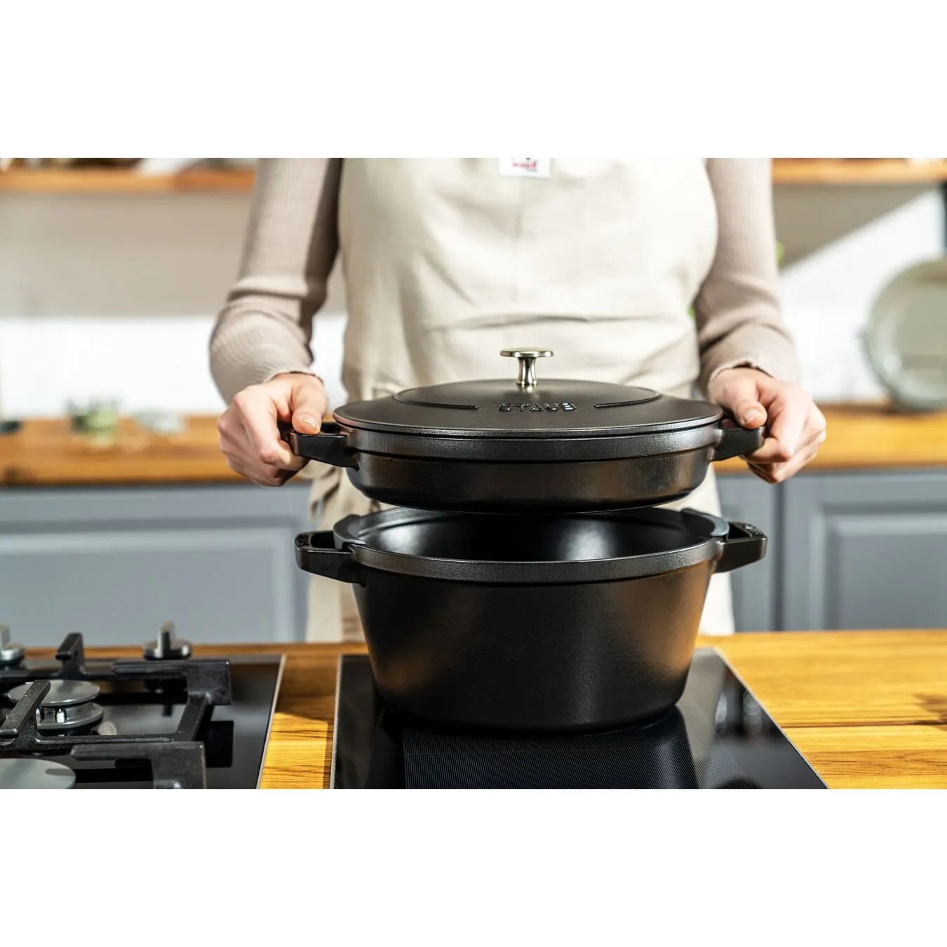 Questo set di prodotti in ghisa nera è composto da una casseruola, una padella e un coperchio, ciascuno con un diametro di 24 cm. Include un set di protezioni per i bordi che vanno posizionati tra la padella e la Cocotte quando si ripongono in dispensa e devono essere rimossi prima di cucinare. Grazie al loro materiale smaltato di alta qualità, queste pentole combinano tutte le eccellenti caratteristiche di cottura e la durevolezza della ghisa con la facilità d’uso e la bellezza delle pentole smaltate.